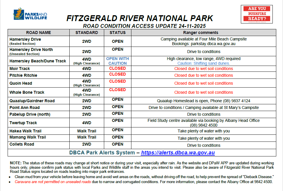 Please note in the latest report from Parks and Wildlife which remains in place until further notice. You will also find a copy of the Road Report on our website www.fitzgeraldcoast.com.au